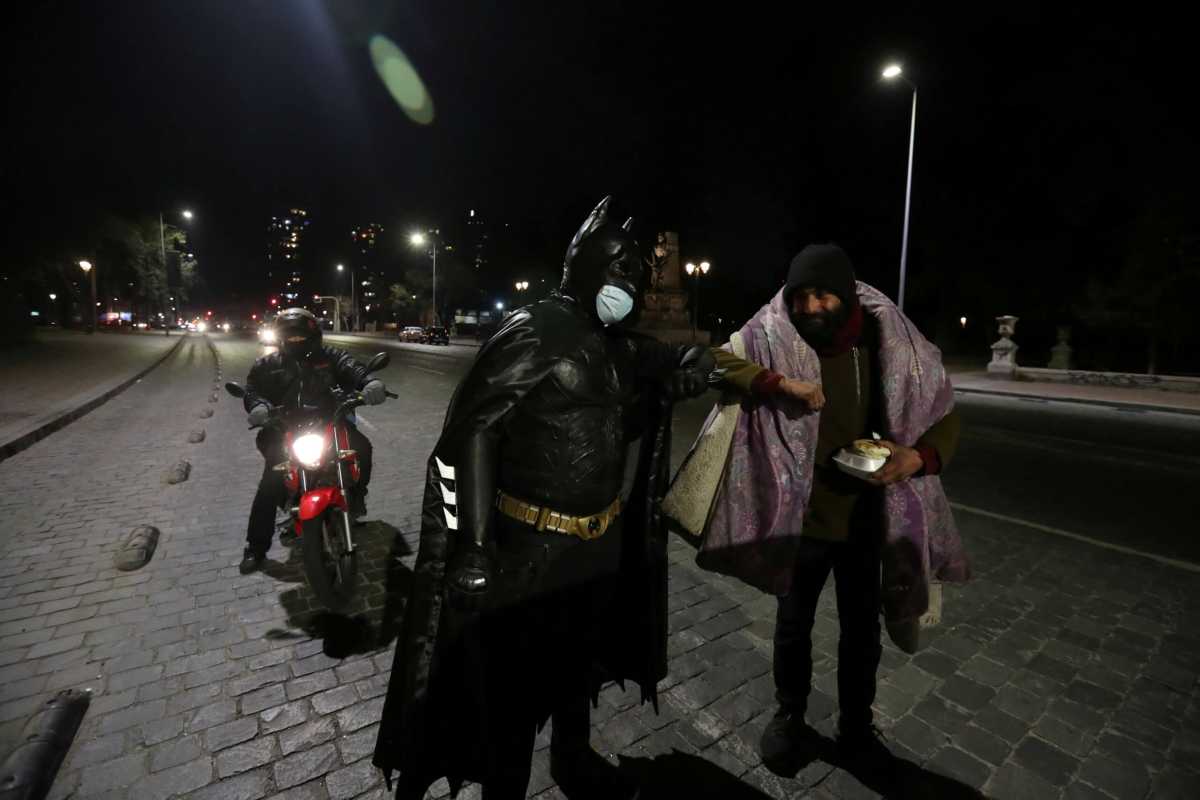 A stranger disguised as Batman is prowling the streets of Santiago delivering food to the homeless, providing sustenance and light-hearted solace to those in need following months of lockdown in the Chilean capital.